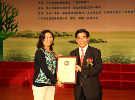 10月17日,在佛山市顺德区第一中学举行的第三届广东省宋庆龄奖学金颁奖典礼上,我会主席卢钟鹤向中国移动通信集团广东分公司代表授牌鸣谢。(黎家进 摄)