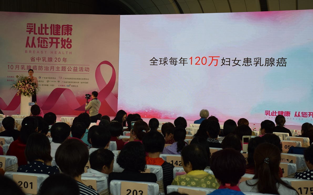 为向公众科普乳腺癌防治知识,推广传播乳腺癌防治理念,2017年10月15日下午,由广东省宋庆龄基金会、广东省中医药协会、广州市越秀区和友苑粉红丝带协会联合主办的“乳此健康,从您开始”关爱乳腺癌妇女公益活动在广州塔举行,省政协原副主席温兰子,我会原理事、省妇联原党组书记周丽琼,我会荣誉理事、广州美术学院原党委书记杨珍妮及我会秘书长蔡延钊等嘉宾共300人参加了活动。广东省中医院乳腺科专家陈前军主任、司徒红林主任、许锐主任分别进行了专题健康讲座,康复病人抗病心得分享以及病人群体——越秀区“粉红丝带”协会成果展示等环节。活动现场共筹得善款206300 元,将全部用于“关爱乳腺癌妇女”项目,我会蔡延钊秘书长向爱心企业颁发了致谢牌匾,对他们的热心善举表示感谢。