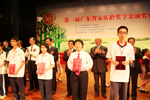 本网讯 10月14日,由我会与省教育厅主办,佛山市顺德区教育局、佛山市顺德区第一中学承办,中国移动通信集团有限公司、广州和氏璧化工材料有限公司、广州市宝盛建设有限公司、完美(中国)有限公司协办的第三届广东省宋庆龄奖学金颁奖典礼在佛山市顺德区第一中学隆重举行。全国人大外事委员会副主任、我会主席卢钟鹤,省委常委、统战部部长周镇宏及我会常务副主席程良洲,我会理事省委统战部副部长赵健、省教育厅副厅长李学明、省国资委副主任戚国强、省工商联副主席卢小周、省交通集团党委副书记马云山、和氏璧化工材料有限公司董事长潘敏琪,我会监事、省委统战部副巡视员陈明,我会秘书长蔡延钊,佛山市委副书记杨晓光,佛山市委常委、顺德区委书记梁维东,佛山市政协副主席、市委统战部长黄炳,顺德区代区长黄喜忠等出席典礼。来自全省21个市、顺德区和省属中学的46名获奖学生代表受到与会领导的接见和颁发获奖证书。典礼上还对捐助支持广东省宋庆龄奖学金的四个协办单位授牌鸣谢。